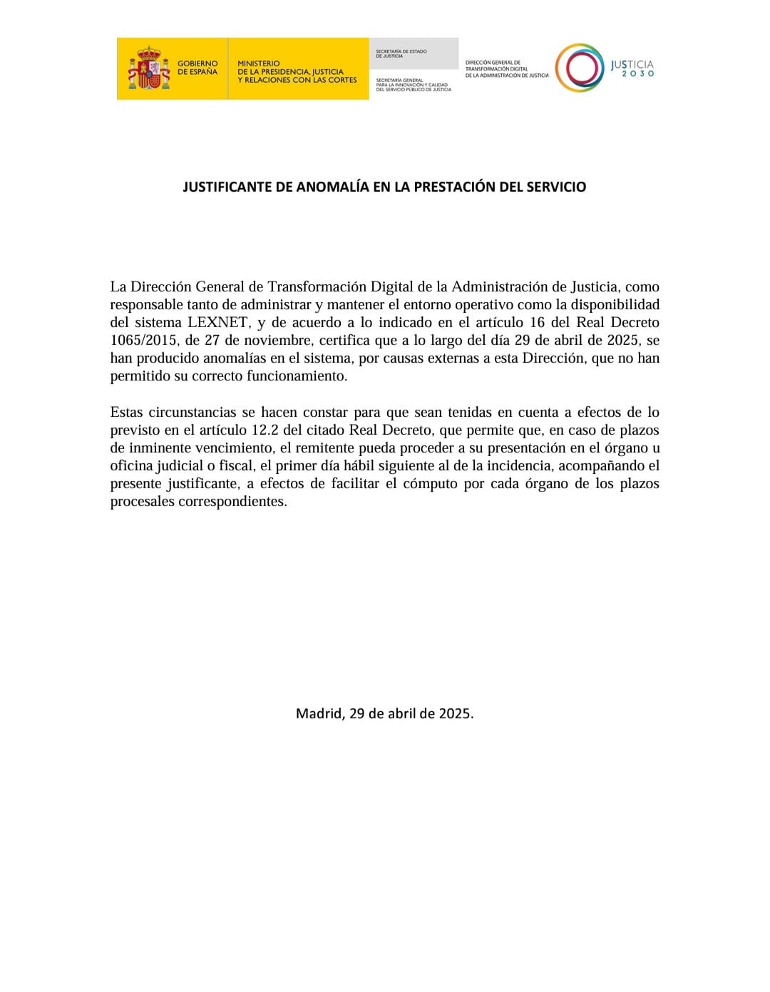 En este sentido, la Dirección General de Transformación Digital de la Administración de Justicia ha certificado que a lo largo del día 29 de abril se han producido anomalías en el sistema que no han permitido su correcto funcionamiento.