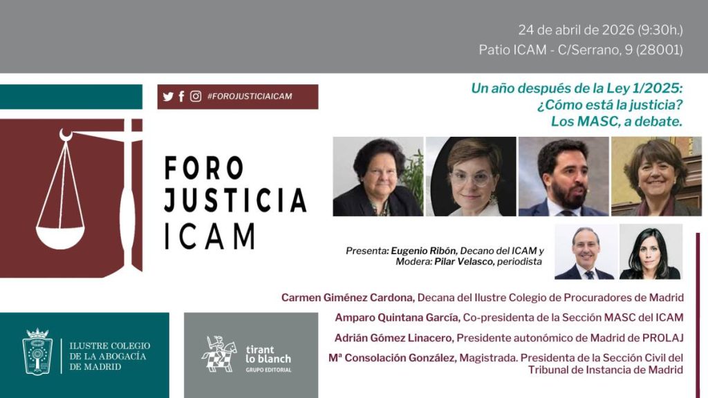 El Ilustre Colegio de la Abogacía de Madrid celebrará el próximo 24 de abril, a las 9:30h., una nueva sesión del Foro Justicia ICAM, un espacio de reflexión y diálogo en torno a los principales retos que afronta el sistema judicial. Bajo el título “Un año después de la Ley 1/2025: ¿Cómo está la justicia? Los MASC, a debate”, el encuentro abordará el impacto de esta norma cuando se cumple un año de su entrada en vigor.