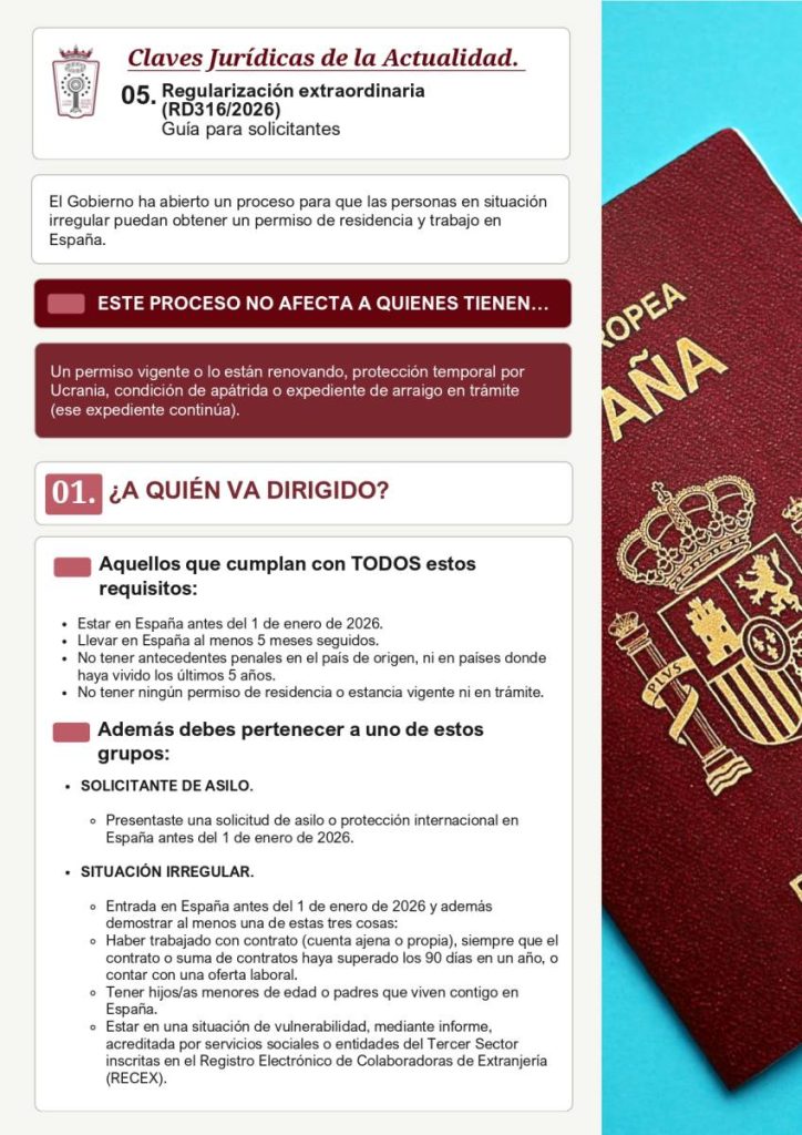 El documento explica de forma detallada en qué consiste este proceso excepcional, que permite a determinadas personas en situación irregular obtener una autorización de residencia y trabajo en España, con plazo de solicitud abierto hasta el 30 de junio de 2026.