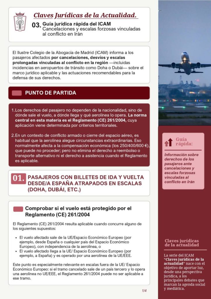 El Ilustre Colegio de la Abogacía de Madrid (ICAM) informa a los pasajeros afectados por cancelaciones, desvíos y escalas prolongadas vinculadas al conflicto en la región —incluidas incidencias en aeropuertos de tránsito como Doha o Dubái— sobre el marco jurídico aplicable y las actuaciones recomendables para la defensa de sus derechos.