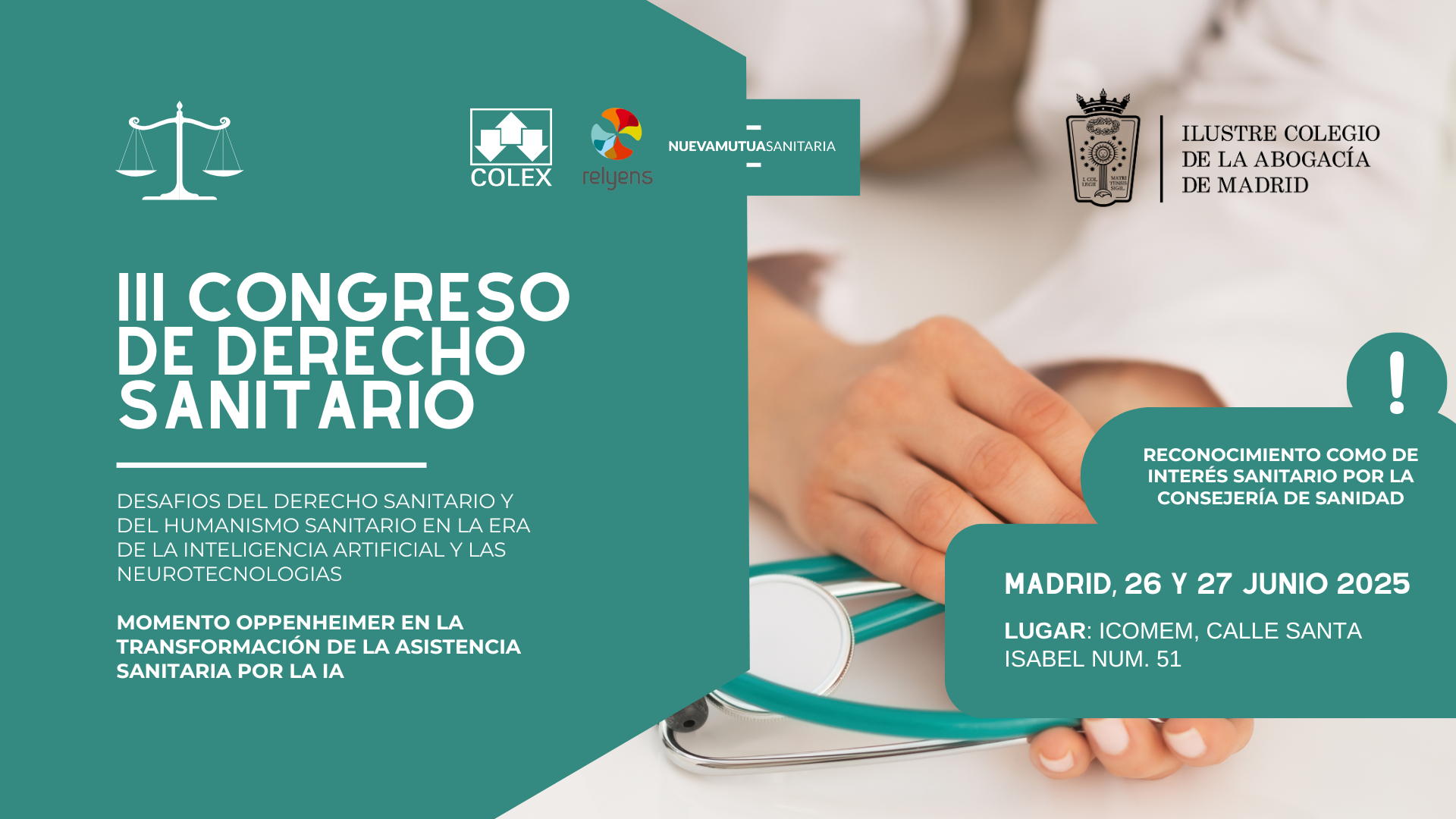 El Ilustre Colegio de la Abogacía de Madrid (ICAM), a través de su Sección de Derecho Sanitario y el Centro de Estudios, pone en marcha una nueva edición de su Congreso de Derecho Sanitario, que tendrá lugar los próximos 26 y 27 de junio de 2025 en la sede del Ilustre Colegio Oficial de Médicos de Madrid (ICOMEM), ubicada en la calle Santa Isabel, nº 51.