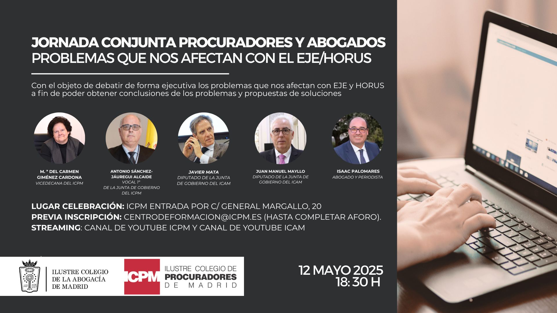 El Ilustre Colegio de la Abogacía de Madrid (ICAM) y el Ilustre Colegio de Procuradores de Madrid (ICPM) organizan el próximo 12 de mayo, a las 18:30h. la primera jornada conjunta dirigida a abordar los problemas que afectan de manera directa a ambos colectivos en relación con el acceso y funcionamiento de los sistemas EJE y HORUS, así como otros aspectos críticos de la operativa judicial digital.