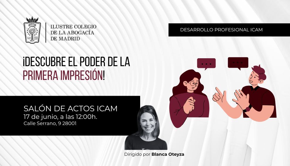 El Departamento de Desarrollo profesional y Empleo del ICAM ha organizado una jornada, el próximo 17 de junio, a las 12:00h., especialmente diseñada para mejorar tu impacto en el entorno laboral desde el primer minuto.