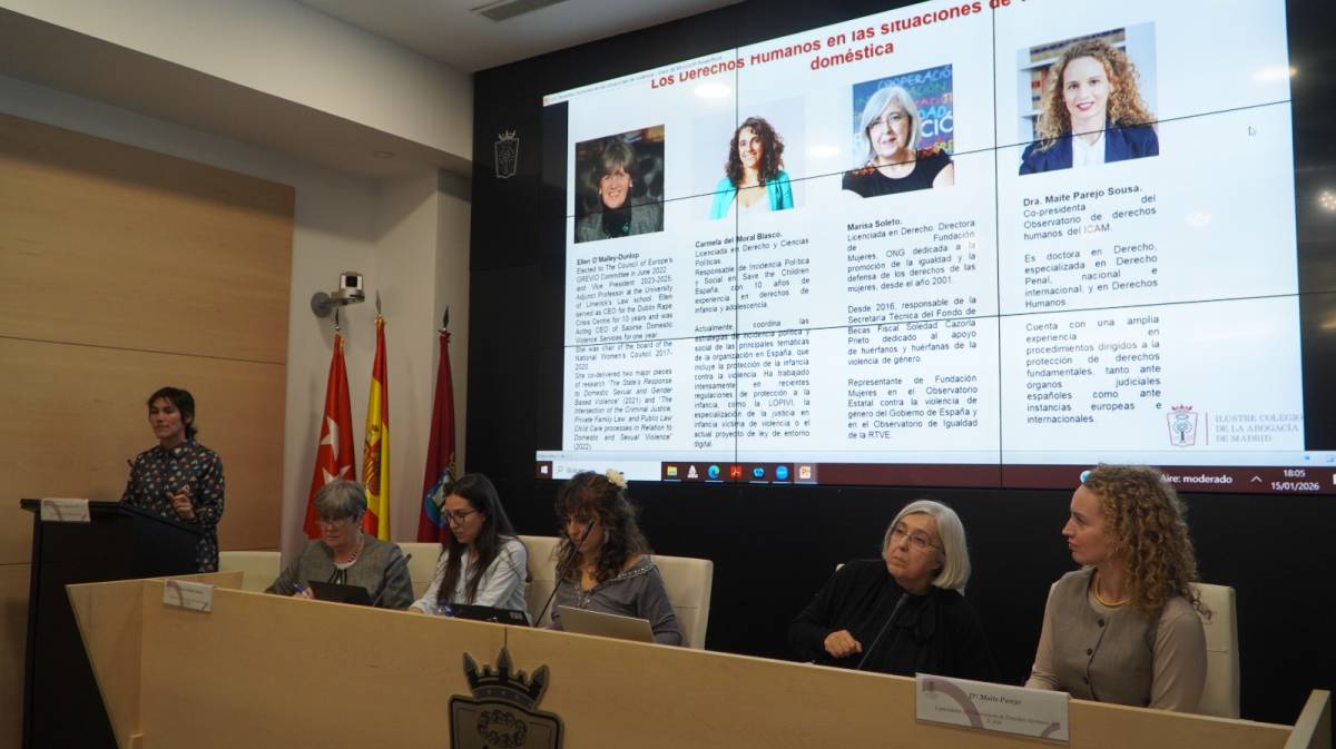 La segunda mesa se centró en la dimensión de los derechos humanos y en la brecha existente entre los marcos normativos internacionales y su aplicación efectiva en la práctica judicial. Intervinieron Ellen O’Malley-Dunlop, representante irlandesa del Grupo GREVIO del Consejo de Europa; Marisa Soleto, directora de Fundación Mujeres; Catalina Perazzo, directora de incidencia social y política en Save the Children España; y Maite Parejo, copresidenta del Observatorio de Derechos Humanos del ICAM. La moderación correspondió a María Giráldez de Luis, miembro de la Sección de Infancia del ICAM.